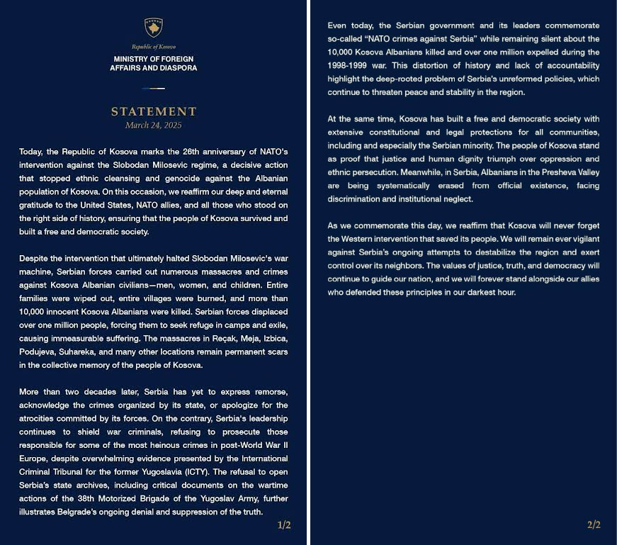 Teksa e përkujtojmë këtë ditë, riafirmojmë se Kosova nuk do ta harrojë kurrë ndërhyrjen perëndimore që e shpëtoi popullin e saj. Ne do të mbetemi gjithmonë vigjilentë ndaj përpjekjeve të vazhdueshme të Serbisë për të destabilizuar rajonin dhe për të ushtruar kontroll mbi fqinjët e saj. Vlerat e drejtësisë, të së vërtetës dhe të demokracisë do të vazhdojnë të udhëheqin kombin tonë, dhe ne do të qëndrojmë përgjithmonë pranë aleatëve tanë që mbrojtën këto parime në orën tonë më të errët.