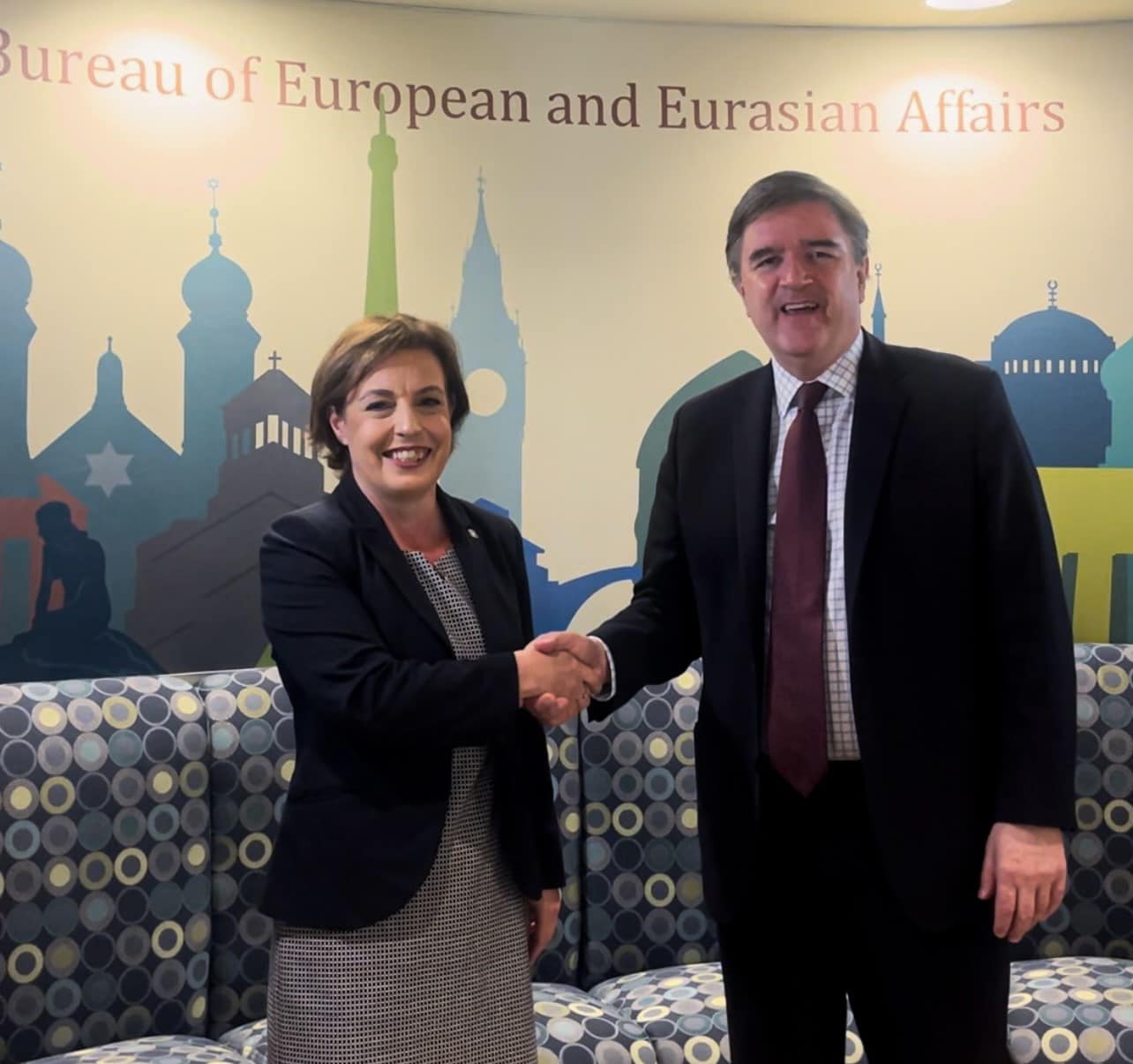 Në kuadër të vizitës zyrtare në Shtetet e Bashkuara të Amerikës, Zëvendëskryeministrja dhe Ministrja e Punëve të Jashtme dhe Diasporës, Donika Gërvalla, është pritur në takim nga Ndihmës Sekretari i Shtetit për çështjet Evropiane dhe Euroaziatike, James O’Brien.
